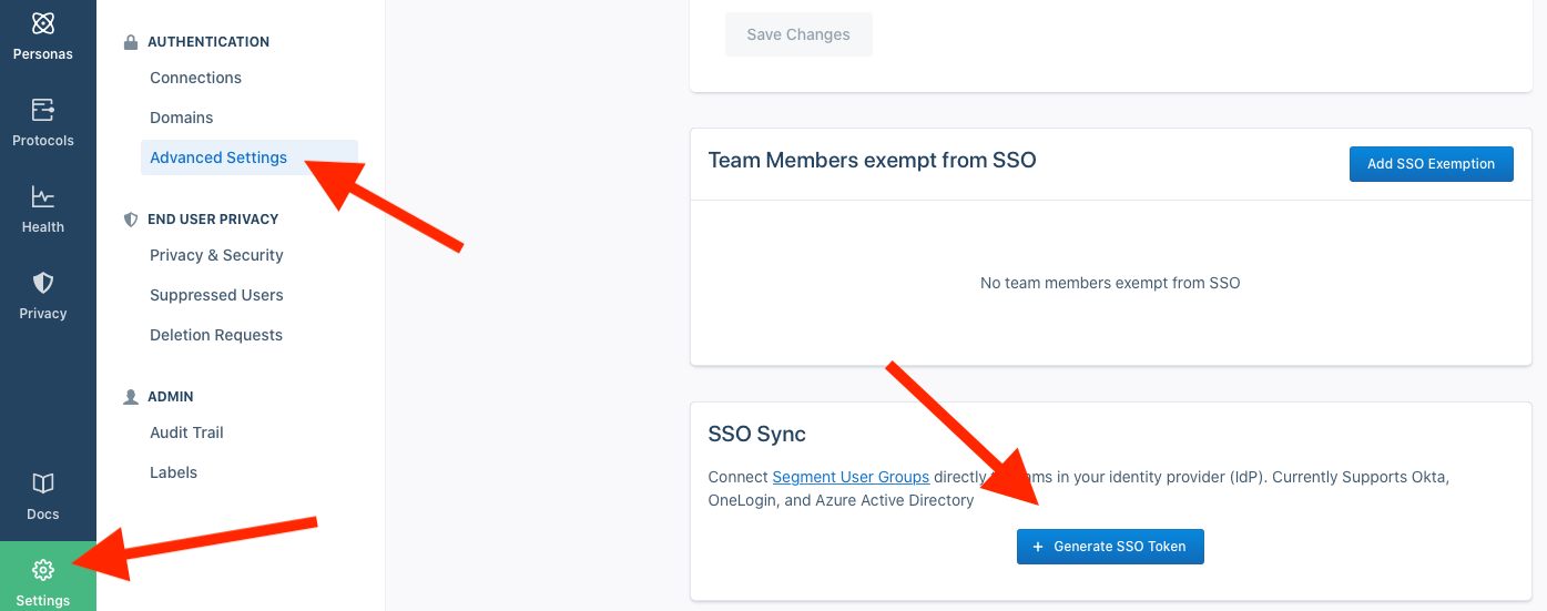 The other value you need is an API key (sometimes referred to as an Authorization Header). To generate one, go to Settings > Advanced Settings in the Segment app, and find the SSO Sync section. Click Generate SSO Token and copy the generated token. Use this token for the API key or Authorization Header in your IdP.