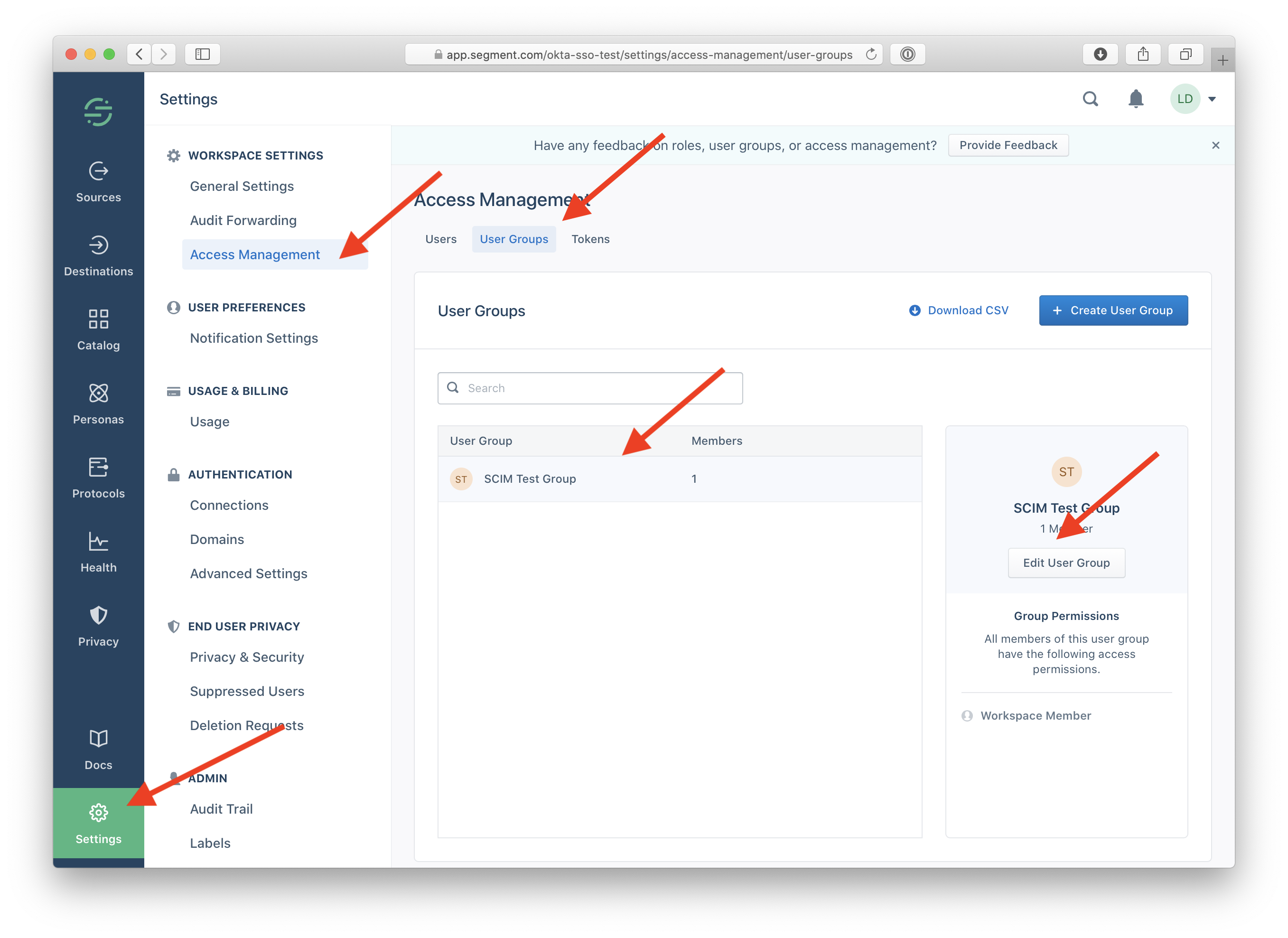 Your IdP can add or remove workspace members from existing groups via SCIM. Your IdP can also update Segment group names.